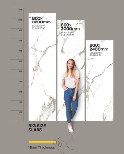 Welcome to Peace Buildcon, your premier destination for high-quality slabs. We offer an extensive range of sizes and finishes to meet diverse project needs. Explore our 800 x 2400 mm slabs, available in 15mm thickness, featuring classic shades like White, Ivory, and Grey at competitive prices, along with rich Brown and Black options. For specialized requirements, we also provide Full Body SNP Light, Dark, and Terrazzo finishes. Discover our larger 800 x 3000 mm and 800 x 3200 mm slabs, perfect for expansive spaces, offering the same elegant color palette and unique Milagro, and Full Body SNP options.